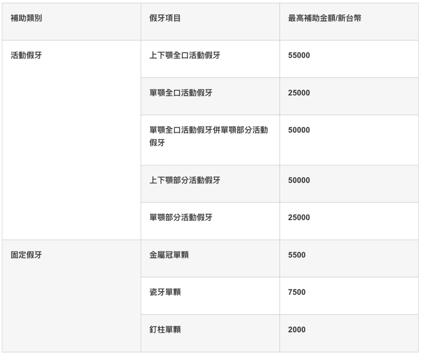 假牙補助內容主要有兩個部分:假牙裝置及假牙維修費用。假牙裝置會依照需求補助全口、半口或部分活動假牙。