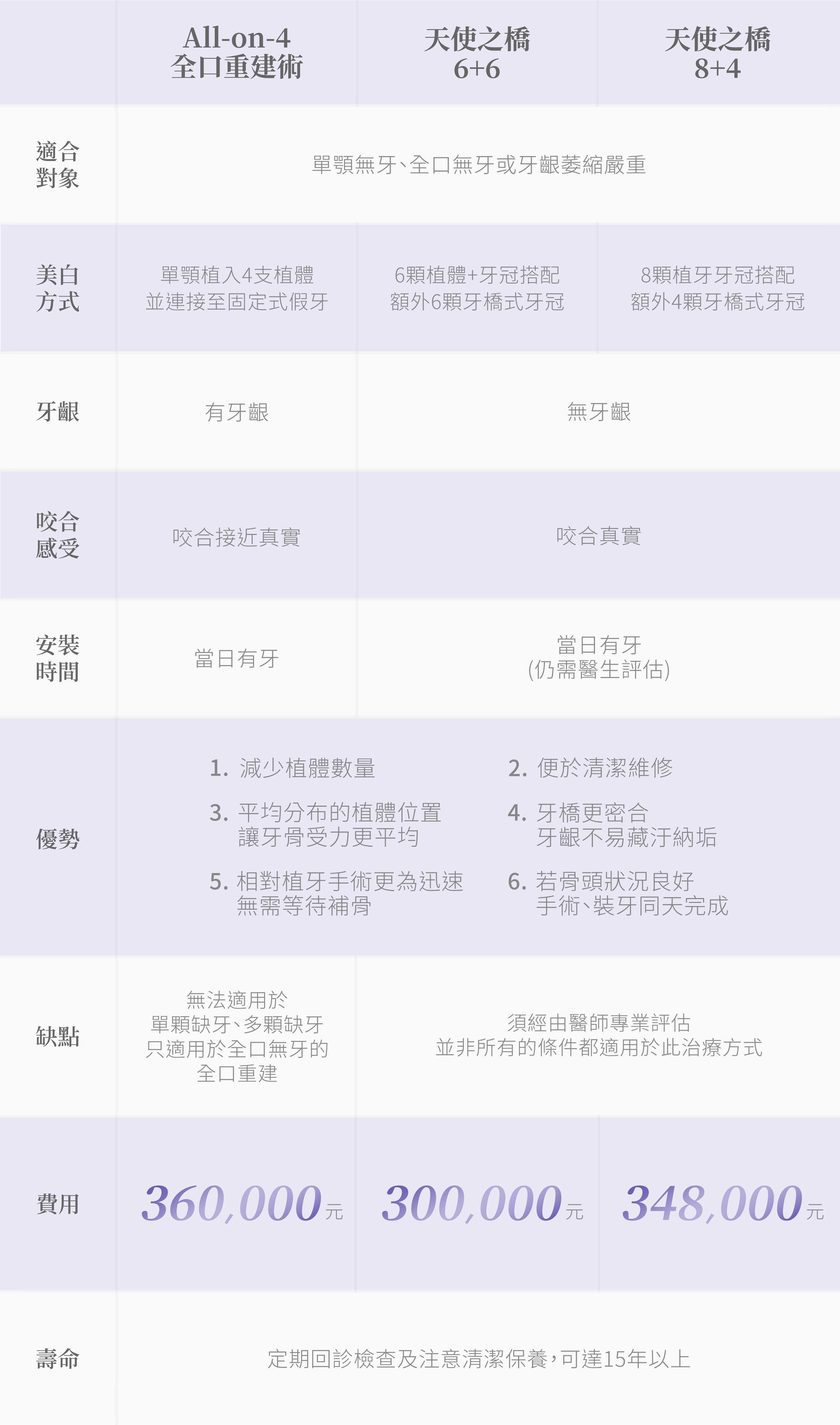 隨著年紀越大,缺牙數會越多,若已經到了無法正常咀嚼食物,生活品質將大幅下降,好不容易有了活動假牙,但卻還要忍受活動假牙常造成的不適與異物感,相信沒有人會樂見的,想擺脫活動假牙的不適感嗎?雅德思牙醫累積了15年以上的植牙臨床經驗,提供優質的醫療服務,給您安心品質與專業,注重每位患者對假牙的需求量身訂製療程,包含全口重建All-on-4、6+6天使之橋、8+4天使之橋療程,以下雅德思牙醫為大家整理各項療程重點: