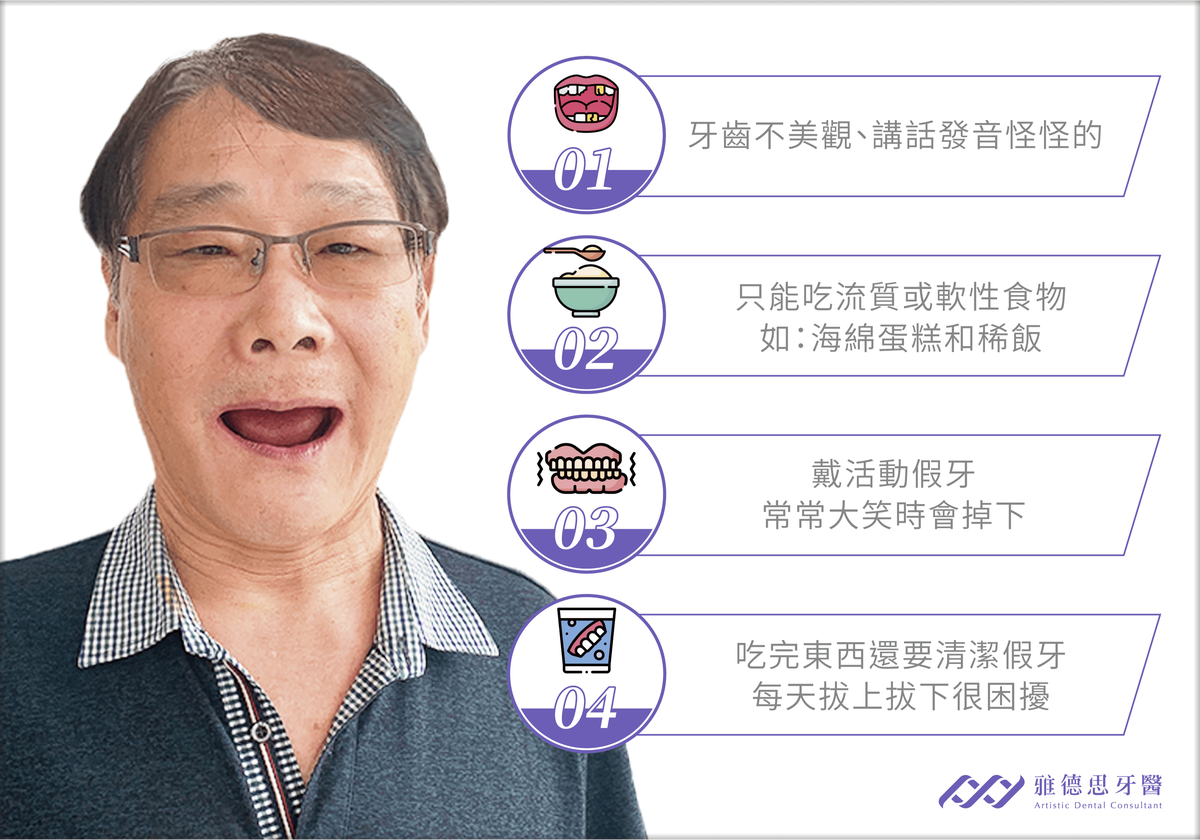 長期戴活動假牙的曾先生,戴了假牙三年多,一直以來深受活動假牙異物感困擾且難以飲食,說話不僅發音不清也常常害怕大笑活動假牙會掉下來,飲食只能吃軟性食物與流質食物,長期下來營養不良,氣色差。