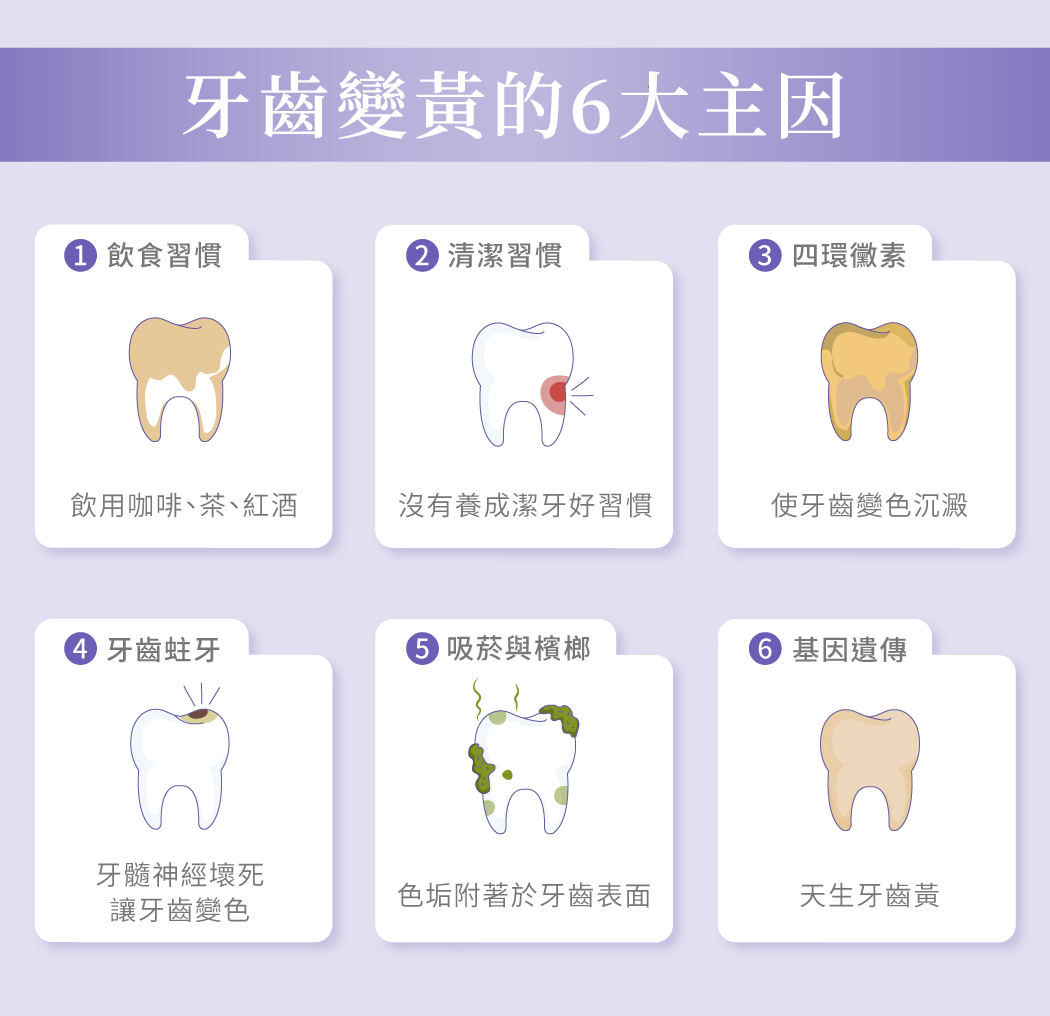 明明都有認真刷牙,但為何隨著年齡或時間,牙齒還是會越來越黃?也許下列的日常生活習慣是造成牙齒日益變黃的因素,了解根本因素才能找到適切方法安全、有效的改善牙齒色澤,幫牙齒恢復亮白。