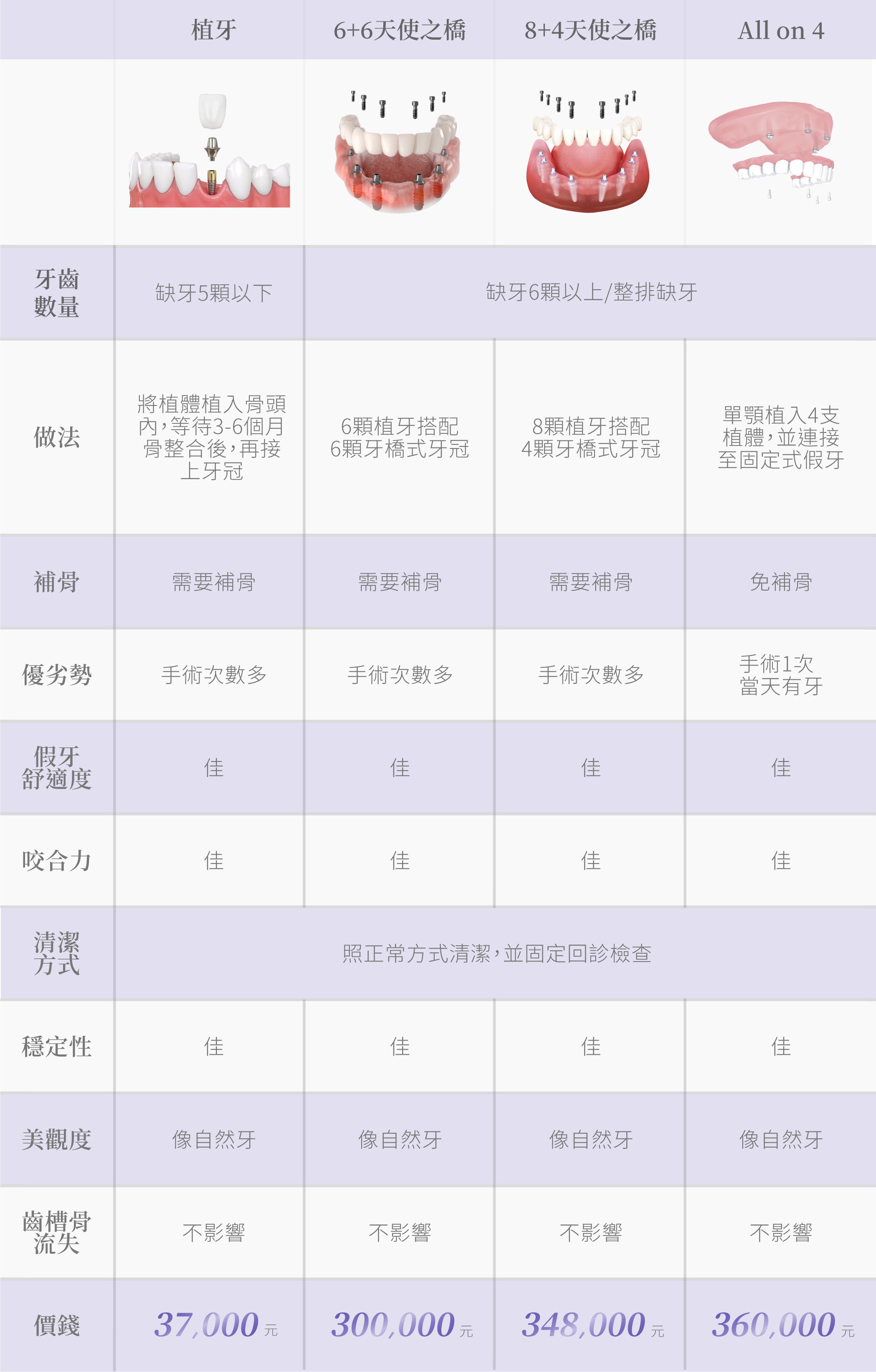 缺牙問題已經很久了,而且缺牙數量越來越多,飲食都成問題了,上網查資料,發現網路上五花八門資訊,有假牙、植牙、牙橋式植牙、天使之橋、all on 4…等治療療程,究竟該怎麼選呢?本文一次替您整理療程比較