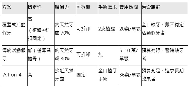 相較於全口植牙,覆蓋式活動假牙使用植體少,所以雅德思牙醫診所治療費用20萬比全口植牙或Allon4價格更親民。