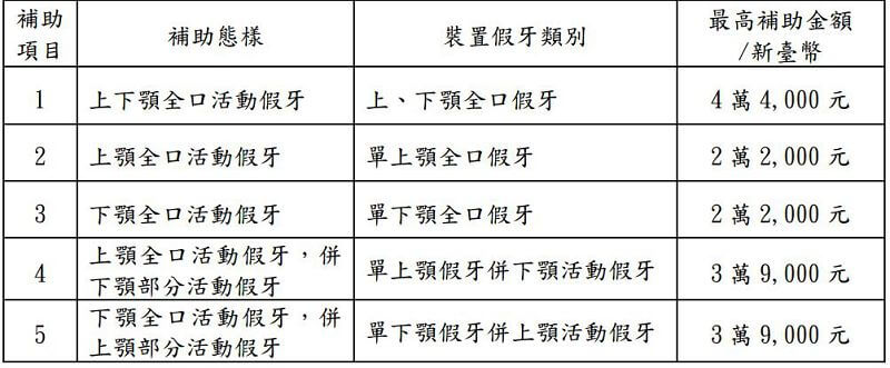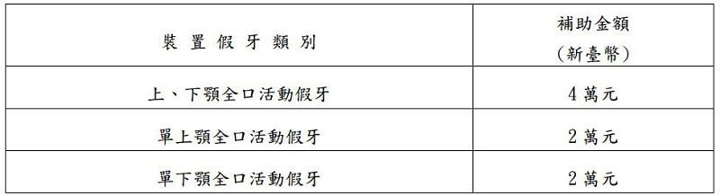1. 全口活動假牙(上顎及下顎健康牙齒【含】各存3顆以內):最高補助金額3萬元