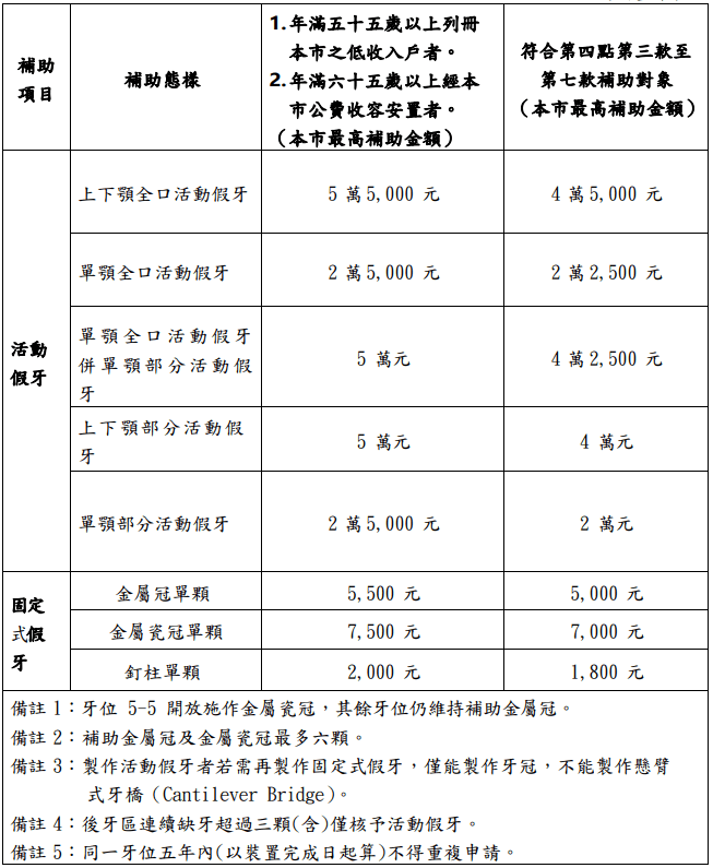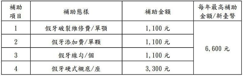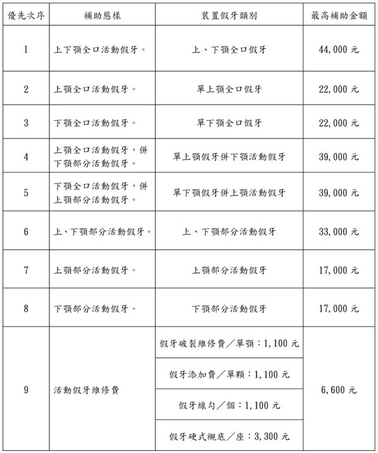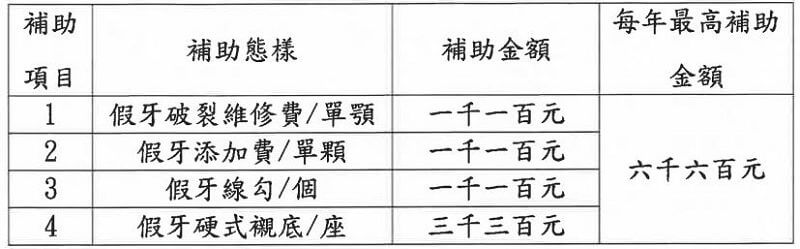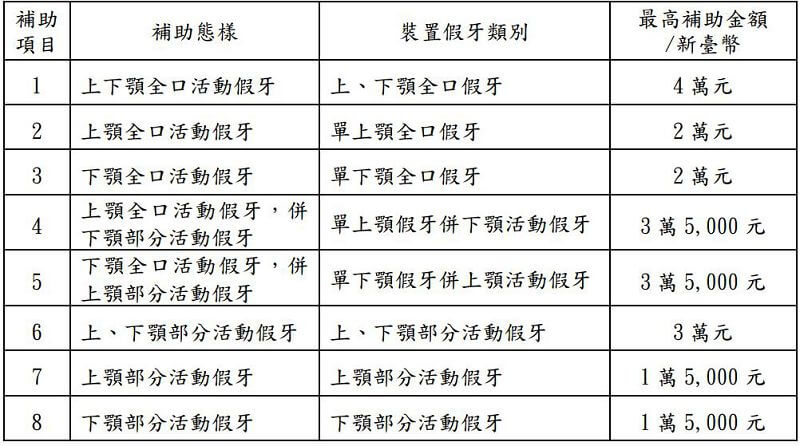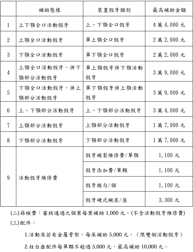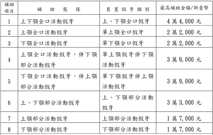分為「假牙製作及裝置補助」和「活動假牙維修補助」兩部分,所有項目每人每年最高補助10萬元。各項目補助金額見下表。更多詳細資訊,也可參考台北市社會局 說明。