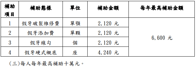 • 假牙破裂維修費/單顎:補助金額1,100元,最高上限6,600元