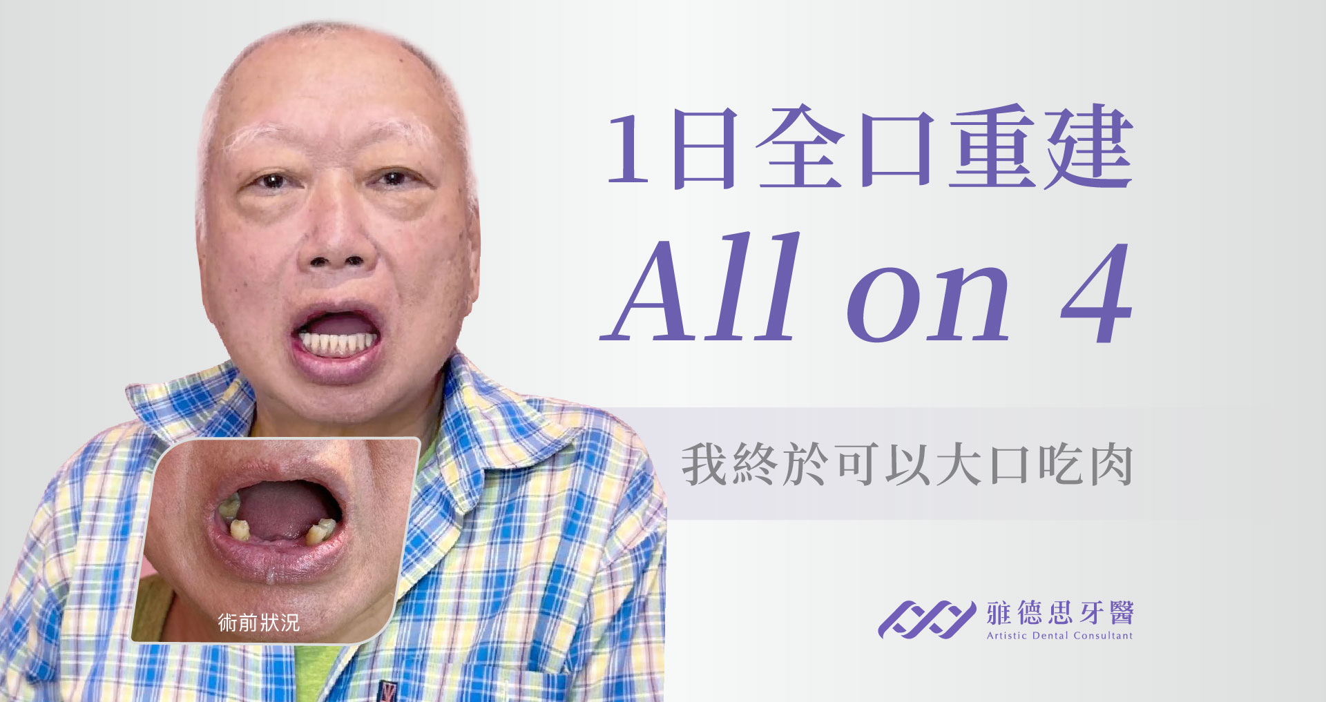 愛出國的何先生,過去喜歡和老婆到處吃美食,自從牙齦逐漸萎縮後,很久沒有正常吃飯了,只能吃軟爛的食物,少了生活樂趣。在朋友介紹下,找到了雅德思1日全口重建,能讓他陪愛妻出國享樂了。